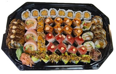 43 stuks sushi sashimi nigiri en 60 stuks special rolls en 2 stuks maguro butsu.