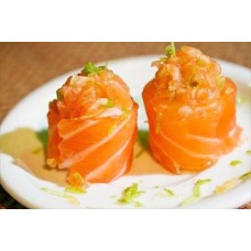 Roll van pikante zalm getopt met zalm, pikante mayonaise en huisbereide saus.