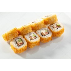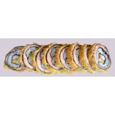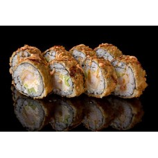Gefrituurde krokante sushi met zalm, krabstick, avocado, tamago, mayo & huisbereide saus.