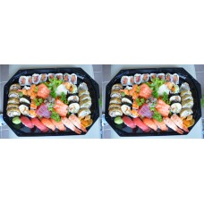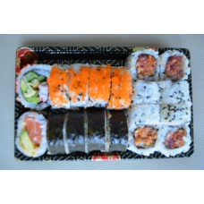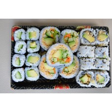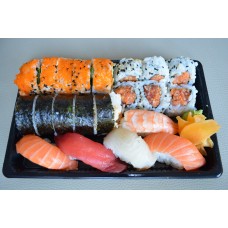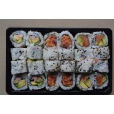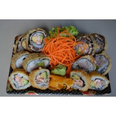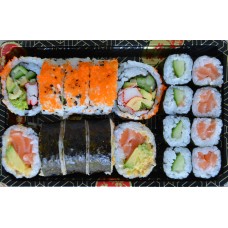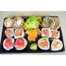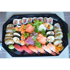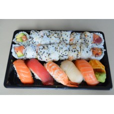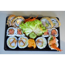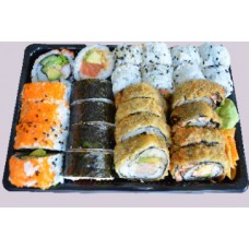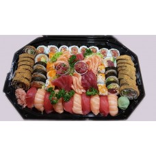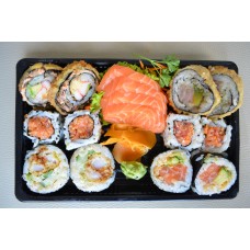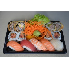 12 stuks sashimi, 4 stuks california, 4 stuks pikante rolls, 4 dragon eyes, 4 stuks tempura maki, 4 stuks manhattan,3 stuks nigiri.