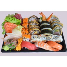10 stuks nigiri, 24 stuks sashimi, 8 stuks california, 8 stuks pikante rolls, 8 stuks dragon eyes, 8 stuks manhattan roll, 8 stuks tempura maki, 1 stuk maguro butsu