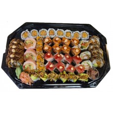 12 stuks nigiri, 32 stuks sashimi, 8 stuks calfornia, 8 stuks pikante rolls, 8 stuks speciale roll, 10 stuks dragon eyes, 10 stuks manhattan roll, 6 stuks tempura maki, 6 stuks newyork roll.