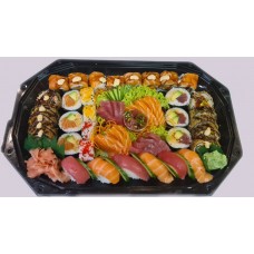 10 stuks nigiri zalm/tonijn, 24 stuks sashimi, 8 in/out zalm/tonijn, 8 stuks pikante tonijn, 8 dragon eyes, 8 stuks manhattan roll, 8 kamikaze zalm en tonijn, 1 maguro butsu.