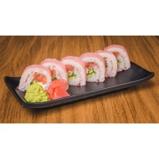 Roll van pikante tonijn getopt met zalm, scampi en tonijn.