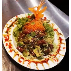 Zalm avocado, tempura huisbereide saus, gefrituurde zalm avocado, huisbereide saus en mayonnaise.